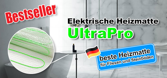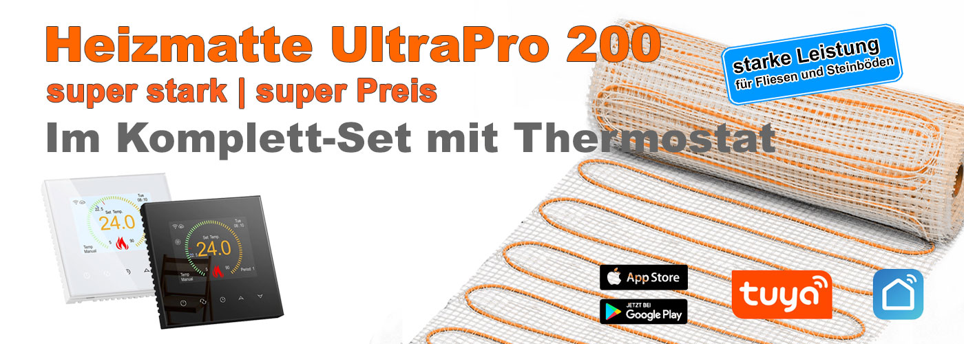 Excellente Fußbodenheizung für Fliesen und Natursteinböden. Die elektrische Heizmatte UltraPro mit 200 W/m² ist für alle fußkalten Bereiche im Alt- und Neubau sehr gut geeignet. Gut geeignet zur Bodentemperierung und als Raumheizung.Die Heizmatten sind komplett wartungsfrei. Das bedeutet, dass Sie für viele Jahre Wärme und Komfort genießen können. Wartungsfreie Technik und Wärmekomfort auf Knopfdruck.Durch die geringe Aufbauhöhe von nur 3 mm ist der Heizmatte auch bei nachträglichen Renovierungsarbeiten leicht einsetzbar. Heizmatte UltraPro 200: Extra stark, schnelle Aufheizzeit leistungsoptimiert beste Qualität extra dünn (3mm) Heizkabel genäht starke Klebeseite (Stickymat) abgeschirmte Zweiaderheizleitung / TWIN kein messbares elektromagnetisches Feld wartungsfrei und langlebig Größen von 1 - 10 m² als Einzelheizmatte, Größen 10 - 16 m² je nach Verfügbarkeit als Kombination von 1 bis 2 Heizmatten. Digitales Thermostat RT-45 Touchscreen Der Thermostat RT-45 ist ein intelligenter, energiesparender Regler, ausgestattet mit einem großen Touchscreen. Regelung über Raum- und Bodensensor, somit optimal geeignet für elektrische Fußbodenheizungen.Das Gerät erfüllt die Anforderungen der EU-Ökodesign-Richtlinie. Eingebauter Luftsensor und externer Bodentemperatursensor (Kabel NTC 10 kOhm). LCD-Touchscreen mit Hintergrundbeleuchtung Aktivierung von Sensoren (1, 2, 1 + 2) Tastensperre / Kindersicherung Manueller Modus Wochenprogrammierung Schnelle Temperaturanpassung Frostschutzfunktion Anzeige für Fehlfunktionen des Sensors Automatische Bildschirmabschaltung Datenspeicher bei ausgeschaltetem Gerät, Stromausfall Manueller ModusDer Regler ist mit der Funktion manueller Einstellungsmodus ausgestattet. Mit dieser Option stellen Sie eine konstante Temperatur ein, die jederzeitbeibehalten wird. WochenprogrammierungVollautomatische Nutzung durch Programmierung des Reglers, der Regler unterstützt eine 7-tägige Programmierung der Heizzeiten mit 6 Ereignissen pro Tag. Schnelle TemperaturanpassungIm Wochenprogrammbetrieb kann ohne Wechsel des Betriebsmodus die Temperatur schnell über die Pfeiltasten angepasst werden.Diese Einstellung ist temporär und wird mit Erreichen des nächsten programmierten Ereignisses wieder abgeschaltet. Die Montage des Thermostats erfolgt in Standard Unterputz-Schalterdosen. Lieferumfang: Thermostat RT-45 Bodentemperaturfühler Montagematerial ausführliche Montageanleitung Elektrische Fußbodenheizungen in Top-Qualität - Made in Germany.Praktisches Komplett-Set, mit Thermostat und Fühlerrohr, von 1 bis 16 m² erhältlich. Die elektrische Heizmatte UltraPro mit 200 W/m² ist für alle fußkalten Bereiche im Alt- und Neubau sehr gut geeignet. Gut geeignet zur Bodentemperierung und als Raumheizung.Die Heizmatten sind komplett wartungsfrei. Das bedeutet, dass Sie für viele Jahre Wärme und Komfort genießen können. Wartungsfreie Technik und Wärmekomfort auf Knopfdruck.Durch die geringe Aufbauhöhe von nur 3 mm ist der Heizmatte auch bei nachträglichen Renovierungsarbeiten leicht einsetzbar. Vorteile elektrische Heizmatte UltraPro: extra dünn (Aufbauhöhe 3 mm), dadurch keine Erhöhung des Bodenniveaus hochwertige Heizleiter mit Isolation aus FEP Schnelle und einfache Installation Zweiader- TWIN Tewchnologie Heizkabel auf das Glasfasergewebe vernäht, dadurch einfache Verlegung. 100% Leistung und schnelle Erwärmung durch optimalen Schleifenabstand Modernste Produktionsanlagen und der Einsatz neuester Technologien garantieren hohe Qualtität und 100 Leistung. Die Heizmatte kann direkt unter den Fliesen im Fliesenkleber installiert werden.Bei einem anderen Bodenbelag z.B. Laminat oder Teppich wird die Heizmatte in Flex-Ausgleichsmasse eingespachtelt. (Überdeckung 5-10 mm).Direkt unter dem neuen Bodenbelag verlegt, sorgen unsere Dünnbettheizmatten mit wenig Aufwand schnell für Wärme im gesamten Raum. Lieferumfang: Elektrische Heizmatte für Fliesen 200 W/m² UltraPro Thermostat nach Wahl Kunstoffwellrohr für den Temperatursensor Montageanleitung Herstellergarantie auf die Heizmatte 10 Jahre, Thermostat 2 Jahre.