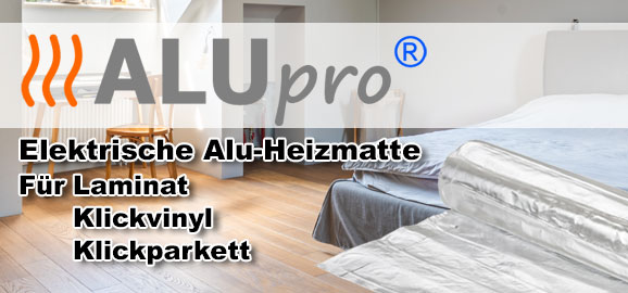 Elektrische Fußbodenheizung AluPro 140 im Komplett-Set mit Thermostat RT-50. Da ist alles dabei, was man für die Installation benötigt.Einfache Installation direkt unter Laminat / Klickvinyl im Badezimmer, Küche, Wohnzimmer, Flur etc.Die AluPro 140 W/m² ist geeignet als Vollheizung oder als Zusatzheizung gegen kalte Füße. Lieferumfang: Elektrische Heizmatte AluPro für Fliesen 140 W/m² Thermostat RT-50 inkl. Temperatursensor Kunstoffwellrohr für den Temperatursensor Montageanleitung mit Prüfprotokoll (deutsch) Thermostat RT-50 touchscreen für elektrische Fußbodenheizung Der Thermostat RT-50 (neue Version) ist ein intelligenter, energiesparender Temperaturregler für elektrische Fußbodenheizungen.. Regelung über Raum- und Bodensensor, somit optimal geeignet für elektrische Fußbodenheizungen.Das Gerät erfüllt die Anforderungen der EU-Ökodesign-Richtlinie. Eigenschaften: Eingebauter Luftsensor und Bodentemperatursensor (Kabel NTC 10 kOhm). Programmierbar, 5 + 2 oder 6 + 1 oder 7 Tage Programm An / aus Schalter LCD-Touchscreen mit Hintergrundbeleuchtung Aktivierung von Sensoren (1, 2, 1 + 2) Ferienprogramm Kindersicherung Manueller Modus Frostschutzfunktion Anzeige für Fehlfunktionen des Sensors Automatische Bildschirmabschaltung Manueller ModusDer Regler ist mit der Funktion manueller Einstellungsmodus ausgestattet. Mit dieser Option stellen Sie eine konstante Temperatur ein, die jederzeitbeibehalten wird. WochenprogrammierungVollautomatische Nutzung durch Programmierung des Reglers, der Regler unterstützt eine 7-tägige Programmierung der Heizzeiten mit 6 Ereignissen pro Tag. Schnelle TemperaturanpassungIm Wochenprogrammbetrieb kann ohne Wechsel des Betriebsmodus die Temperatur schnell über die Pfeiltasten angepasst werden.Diese Einstellung ist temporär und wird mit Erreichen des nächsten programmierten Ereignisses wieder abgeschaltet. Elektrische Fußbodenheizung AluPro 140: Unsere Aluminium-Heizmatte AluPro ist speziell für den Einsatz als Fußbodenheizung unter Laminat, Klickvinyl, Klickparkett und andere schwimmende Fußbodenbeläge entwickelt worden. Die Aluminium-Heizmatte AluPro wird direkt unter dem Bodenbelag verlegt, bereits mit einer geringen Leistung kann somit der angenehme Heizeffekt einer Fußbodenheizung erzielt werden.Einfache Verlegung, die Aluminium-Heizmatte AluPro wird direkt auf der Trittschalldämmung ausgelegt, darüber kommt dann das Laminat oder Parkett, fertig.Aufgrund der geringen Aufbauhöhe von ca. 1 mm entsteht keine zusätzliche Erhöhung des Bodenniveaus. Die doppelte Aluminiumschicht nimmt die Wärme optimal auf und verteilt die Wärme gleichmäßig über die gesamte Fläche. Vorteile der AluPro Heizmatten: geringer Energiebedarf durch direkte Installation unter dem Bodenbelag keine Erhöhung des Bodenniveaus, Aufbauhöhe Heizmatte ca. 1 mm einfache Montage, da trockene Verlegung, kein Kleber notwendig wartungsfrei, langlebig, AluPro Heizmatten mit 10 Jahren Herstellergarantie Optimal auf Laminat / Parkettböden abgestimmt Die Aluminium-Heizmatte AluPro für Parkett und Laminatböden ist optimal geeignet für Neubauprojekte, bei der Altbausanierungen und Renovierung.Ideal auch für Mietobjekte da durch die trockene Verlegung ein problemloser Rückbau möglich ist.Einfache Montage durch schwimmende Verlegung. 140 W/m² geeignet als Raumheizung und zur Bodentemperierung. perfekt für Neubau, Altbausanierung und Renovierung Schwimmende Verlegung auf Estrich geringe Aufbauhöhe einfache Montage ideale Wärmeverteilung durch spezielle Folienoberfläche Magnetfeldarmer Betrieb ( < 25 nT) Stellen Sie vor der Montage sicher, dass der Untergrund ausreichend gedämmt ist. Größen von 1 - 10 m² als Einzelheizmatte, Größen über 10 m² je nach Verfügbarkeit als Kombination von 1 bis 3 Heizmatten.