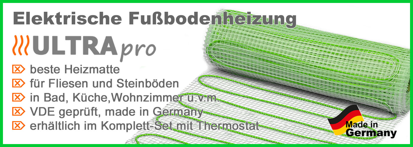 Excellente Fußbodenheizung für Fliesen und Natursteinböden. Die elektrische Heizmatte UltraPro mit 200 W/m² ist für alle fußkalten Bereiche im Alt- und Neubau sehr gut geeignet. Gut geeignet zur Bodentemperierung und als Raumheizung.Die Heizmatten sind komplett wartungsfrei. Das bedeutet, dass Sie für viele Jahre Wärme und Komfort genießen können. Wartungsfreie Technik und Wärmekomfort auf Knopfdruck.Durch die geringe Aufbauhöhe von nur 3 mm ist der Heizmatte auch bei nachträglichen Renovierungsarbeiten leicht einsetzbar. Heizmatte UltraPro 200: Extra stark, schnelle Aufheizzeit leistungsoptimiert beste Qualität extra dünn (3mm) Heizkabel genäht starke Klebeseite (Stickymat) abgeschirmte Zweiaderheizleitung / TWIN kein messbares elektromagnetisches Feld wartungsfrei und langlebig Größen von 1 - 10 m² als Einzelheizmatte, Größen 10 - 16 m² je nach Verfügbarkeit als Kombination von 1 bis 2 Heizmatten. Digitales Thermostat RT-45 Touchscreen Der Thermostat RT-45 ist ein intelligenter, energiesparender Regler, ausgestattet mit einem großen Touchscreen. Regelung über Raum- und Bodensensor, somit optimal geeignet für elektrische Fußbodenheizungen.Das Gerät erfüllt die Anforderungen der EU-Ökodesign-Richtlinie. Eingebauter Luftsensor und externer Bodentemperatursensor (Kabel NTC 10 kOhm). LCD-Touchscreen mit Hintergrundbeleuchtung Aktivierung von Sensoren (1, 2, 1 + 2) Tastensperre / Kindersicherung Manueller Modus Wochenprogrammierung Schnelle Temperaturanpassung Frostschutzfunktion Anzeige für Fehlfunktionen des Sensors Automatische Bildschirmabschaltung Datenspeicher bei ausgeschaltetem Gerät, Stromausfall Manueller ModusDer Regler ist mit der Funktion manueller Einstellungsmodus ausgestattet. Mit dieser Option stellen Sie eine konstante Temperatur ein, die jederzeitbeibehalten wird. WochenprogrammierungVollautomatische Nutzung durch Programmierung des Reglers, der Regler unterstützt eine 7-tägige Programmierung der Heizzeiten mit 6 Ereignissen pro Tag. Schnelle TemperaturanpassungIm Wochenprogrammbetrieb kann ohne Wechsel des Betriebsmodus die Temperatur schnell über die Pfeiltasten angepasst werden.Diese Einstellung ist temporär und wird mit Erreichen des nächsten programmierten Ereignisses wieder abgeschaltet. Die Montage des Thermostats erfolgt in Standard Unterputz-Schalterdosen. Lieferumfang: Thermostat RT-45 Bodentemperaturfühler Montagematerial ausführliche Montageanleitung Elektrische Fußbodenheizungen in Top-Qualität - Made in Germany.Praktisches Komplett-Set, mit Thermostat und Fühlerrohr, von 1 bis 16 m² erhältlich. Die elektrische Heizmatte UltraPro mit 200 W/m² ist für alle fußkalten Bereiche im Alt- und Neubau sehr gut geeignet. Gut geeignet zur Bodentemperierung und als Raumheizung.Die Heizmatten sind komplett wartungsfrei. Das bedeutet, dass Sie für viele Jahre Wärme und Komfort genießen können. Wartungsfreie Technik und Wärmekomfort auf Knopfdruck.Durch die geringe Aufbauhöhe von nur 3 mm ist der Heizmatte auch bei nachträglichen Renovierungsarbeiten leicht einsetzbar. Vorteile elektrische Heizmatte UltraPro: extra dünn (Aufbauhöhe 3 mm), dadurch keine Erhöhung des Bodenniveaus hochwertige Heizleiter mit Isolation aus FEP Schnelle und einfache Installation Zweiader- TWIN Tewchnologie Heizkabel auf das Glasfasergewebe vernäht, dadurch einfache Verlegung. 100% Leistung und schnelle Erwärmung durch optimalen Schleifenabstand Modernste Produktionsanlagen und der Einsatz neuester Technologien garantieren hohe Qualtität und 100 Leistung. Die Heizmatte kann direkt unter den Fliesen im Fliesenkleber installiert werden.Bei einem anderen Bodenbelag z.B. Laminat oder Teppich wird die Heizmatte in Flex-Ausgleichsmasse eingespachtelt. (Überdeckung 5-10 mm).Direkt unter dem neuen Bodenbelag verlegt, sorgen unsere Dünnbettheizmatten mit wenig Aufwand schnell für Wärme im gesamten Raum. Lieferumfang: Elektrische Heizmatte für Fliesen 200 W/m² UltraPro Thermostat nach Wahl Kunstoffwellrohr für den Temperatursensor Montageanleitung Herstellergarantie auf die Heizmatte 10 Jahre, Thermostat 2 Jahre.