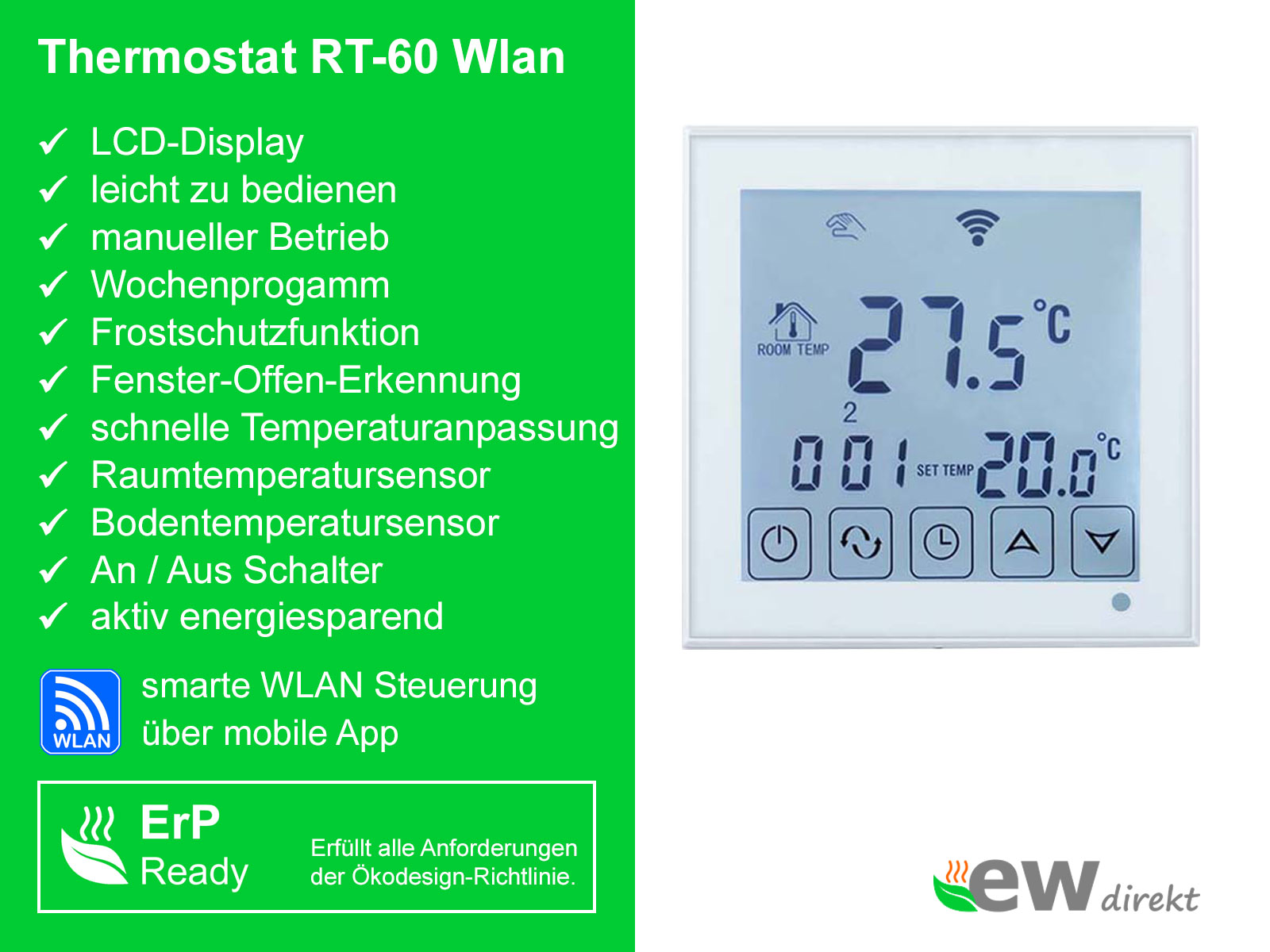 Die Heizmatten AL-MAT sind unter schwimmend verlegte Laminat- und Holzfußböden bestimmt. Als Heizelement dienen hier spezielle Leiter mit Fluoropolymer-Doppelisolierung und hoher Warmfestigkeit. Dadurch ist außergewöhnliche Lebensdauer des Heizelements bei der höchsten Sicherheit garantiert. Die Matte ist als eine zweiadrige Matte mit einem Anschlussleiter (sog. kaltem Ende) von 3 m ausgeführt. Die Leiter sind zwischen zwei Aluminiumfolien angebracht – die obere Schicht, welche im Kontakt mit dem Belag steht, ist mit PE-Gewebe zwecks hoher mechanischer Widerstandsfestigkeit verstärkt. Die Stärke der Matte beträgt dabei ca. 1,7 mm (!). Die Installierung erfolgt auf dieselbe Weise wie bei den üblichen Heizmatten. AL-MAT 140 W/m² sind geeignet als Raumheizung und zur Bodentemperierung. perfekt für Neubau, Altbausanierung und Renovierung Schwimmende Verlegung auf Estrich geringe Aufbauhöhe einfache Montage ideale Wärmeverteilung Größen von 1 - 10 m² als Einzelheizmatte, Größen 10 - 20 m² als Kombination von 2 Heizmatten. Thermostat RT-60 Wlan für elektrische Fußbodenheizung Der Thermostat RT-60 Wlan ist ein moderner Regler, der mit einem Touchscreen und einem drahtlosen WiFi 4G-Steuermodul ausgestattet ist. Der Thermostat RT-60 Wlan ist vollständig programmierbar. Kompatibel mit Amazon Alexa und Google Home. Das Gerät erfüllt die Anforderungen der EU-Ökodesign-Richtlinie. Eingebauter Luftsensor und Bodentemperatursensor (Kabel NTC 10 kOhm). Programmierbar An / aus Schalter LCD-Touchscreen mit Hintergrundbeleuchtung Aktivierung von Sensoren (1, 2, 1 + 2) Ferienprogramm Kindersicherung Manueller Modus WiFi-Steuerung über mobile App Frostschutzfunktion Anzeige für Fehlfunktionen des Sensors Automatische Bildschirmabschaltung Unser Raumtemperaturregler RT-60 passt in jede Standard Unterputzdosen/ Schalterdosen mit Geräteschrauben-Abstand 60 mm. Stellen Sie vor der Montage sicher, dass der Untergrund ausreichend gedämmt ist.