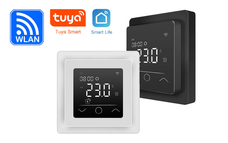 Elektrische Heizmatte SunPro mit Thermostat RT-63 Wlan - Tuya / Smartlife - Amazon Alexa / Google Home Heizmatte SunPro: Leistungsoptimiert, beste Qualität - made in Germany, extra dünn (3mm), Heizleiter auf Haltegitter mit Klebeband fixiert, starke Klebeseite (Stickymat) Thermostat RT-63: großer Touchscreen, einfache Bedienung über Smartphone Tuya / Smartlife App, Sprachsteuerung über Google Home / Amazon Alexa Lieferumfang: Elektrische Heizmatte SunPro für Fliesen 160 W/m² Thermostat RT-63 Tuya / Smartlife inkl. Temperatursensor Kunstoffwellrohr für den Temperatursensor Montageanleitung mit Prüfprotokoll (deutsch) Dieses Set beinhaltet alle für den Betrieb notwendigen Komponenten. Größen von 1 - 10 m² als Einzelheizmatte, Größen 10 - 21 m² je nach Verfügbarkeit als Kombination von 1 bis 2 Heizmatten. Herstellergarantie auf die Heizmatte 10 Jahre, Thermostat 2 Jahre. Heizmatte SunPro mit 160 W/m², sehr gut geeignet für Neubauobjekte, zur Altbausanierung und Renovierung. Gut geeignet zur Bodentemperierung und als Raumheizung in allen Räumen mit Fliesen oder Steinböden.Durch die geringe Aufbauhöhe von nur 3 mm ist der Heizmatte auch bei nachträglichen Renovierungsarbeiten leicht einsetzbar. Vorteile elektrische Heizmatte: extra dünn (Aufbauhöhe 3 mm), dadurch keine Erhöhung des Bodenniveaus Breite der Heizmatte 50 cm hochwertige Heizleiter mit Isolation aus FEP schnelle und einfache Installation Heizkabel auf das Glasfasergewebe mit Klebebändern fixiert. schnelle Erwärmung durch optimalen Schleifenabstand Thermostat RT-63 Wlan | schwarz - Tuya / Smartlife für elektrische Fußbodenheizung Der RT-63 ist ein digitales, programmierbares WLAN Thermostat mit Touchdisplay zur Steuerung elektrischer Fußbodenheizungen im Innenbereich. Der RT-63 kann bequem per WLAN (Netzwerkstandard IEEE 802.11. b/g/n 2.4 GHz) mittels der kostenlosen Tuya Smart App / Smartlife für iOS- und Android-Geräte eingestellt werden. Dank der übersichtlichen Menüstruktur und des Touchdisplays ist die Handhabung des Gerätes äußerst benutzerfreundlich. Der RT-63 bietet verschiedene Betriebsarten zur Heizungssteuerung. Die Wochenprogrammierung nach einem 4-Phasen-Heizzeitplan ermöglicht eine Steuerung nach dem individuellen Tagesablauf des Benutzers. Die Temperatursteuerung ist wahlweise über den mitgelieferten Bodensensor oder den fest im Gerät verbauten Raumsensor möglich. Die adaptive Regelung des Heizbeginns (intelligente Selbstlernfunktion) und die Fenster-Offen-Erkennung tragen zu einem energieeffizienten Betrieb der Heizung bei. Kompatibel mit Amazon Alexa und Google Home. Das Gerät erfüllt die Anforderungen der EU-Ökodesign-Richtlinie. Wochenprogramm mit 4-Phasen-Heizzeitplan gut lesbares Touchdisplay Hintergrundbeleuchtung einfache Programmierung Steuerung übers Mobiltelefon mit der Tuya Smart App Boden-und Raumtemperaturfühler Fenster-Offen-Erkennung Adaptive Regelung für maximale Effizienz passt in gänginge Einbaurahmen erfüllt alle Anfordrung an die EcoDesign Richtline 2009/125/EG Besonderheit: es können unterschiedliche Bodensensortypen angeschloßen werden, 3, 5, 6.8, 10, 12, 15, 20, 22, 33, 47 kOhm Die Montage des Thermostats RT-63 erfolgt in Standard Unterputz-Schalterdosen, Durchmesser von 68 mm. Bei einem anderen Bodenbelag z.B. Laminat oder Teppich wird die Heizmatte in Flex-Ausgleichsmasse eingespachtelt. (Überdeckung 5-10 mm).Direkt unter dem neuen Bodenbelag verlegt, sorgen unsere Dünnbettheizmatten mit wenig Aufwand schnell für Wärme im gesamten Raum. Lieferumfang: Elektrische Heizmatte SunPro für Fliesen 160 W/m² Thermostat RT-63 Tuya / Smartlife inkl. Temperatursensor Kunstoffwellrohr für den Temperatursensor Montageanleitung mit Prüfprotokoll (deutsch) Herstellergarantie auf die Heizmatte 10 Jahre, Thermostat 2 Jahre.