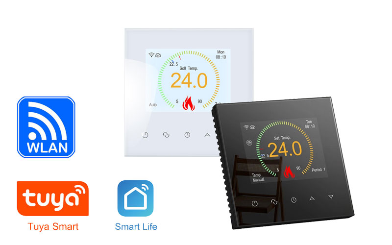 Moderner Temperaturregler, einfache Bedienung über das hochauflösende Farb-Touch-Display oder über die kostenlose Tuya / Smartlife App. Exakte Regelung über Raum- und Bodensensor, optimal geeignet für elektrische Fußbodenheizungen.