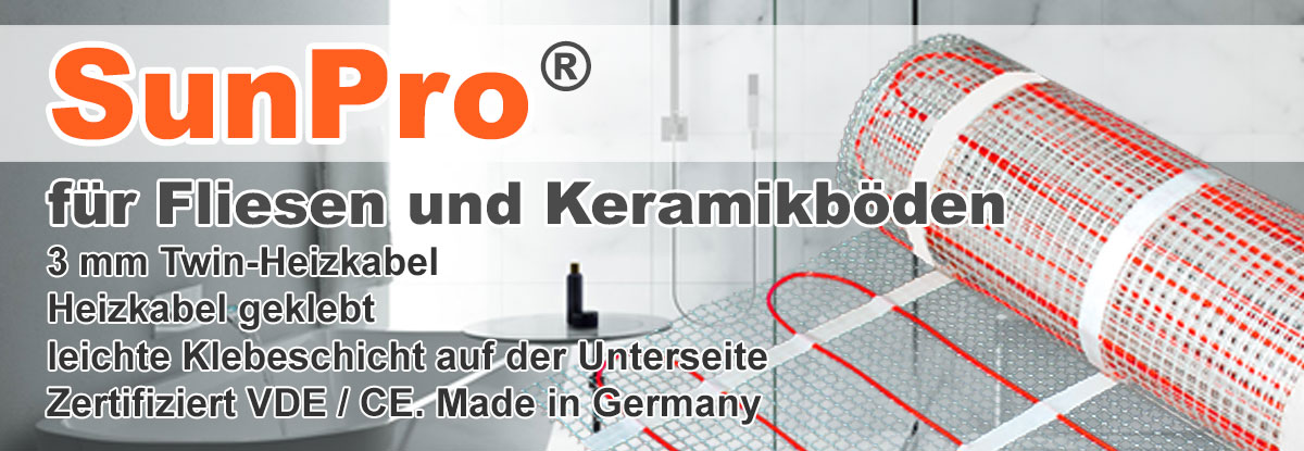 Elektrische Fußbodenheizungen in Top-Qualität - Made in Germany. Praktisches Komplett-Set, mit Thermostat und Fühlerrohr, von 1 bis 20 m² erhältlich. Lieferumfang: Elektrische Heizmatte SunPro für Fliesen 160 W/m² Thermostat RT-50 inkl. Temperatursensor Kunstoffwellrohr für den Temperatursensor Montageanleitung mit Prüfprotokoll (deutsch) Dieses Set beinhaltet alle für den Betrieb notwendigen Komponenten. Elektrische Heizmatte SunProDie elektrische Heizmatte SunPro mit 160 W/m² ist sehr gut geeignet zur Bodentemperierung und als Raumheizung. Die Heizmatten sind komplett wartungsfrei. Das bedeutet, dass Sie für viele Jahre Wärme und Komfort genießen können. Wartungsfreie Technik und Wärmekomfort auf Knopfdruck. Durch die geringe Aufbauhöhe von nur 3 mm ist der Heizmatte auch bei nachträglichen Renovierungsarbeiten leicht einsetzbar. Aufgrund ihrer geringen Aufbauhöhe von ca. 3 mm kann die Heizmatte problemlos unter den Fliesen / Naturstein in den Fliesenkleber bzw. eine dünne Schicht Ausgleichsmasse eingebettet werden. Vorteile elektrische Heizmatte: extra dünn (Aufbauhöhe 3 mm), dadurch keine Erhöhung des Bodenniveaus hochwertige Heizleiter mit Isolation aus FEP Schnelle und einfache Installation Heizkabel auf das Glasfasergewebe mit Klebebändern fixiert. schnelle Erwärmung durch optimalen Schleifenabstand Thermostat RT-50Der Thermostat RT-50 ist ein intelligenter, energiesparender Temperaturregler für elektrische Fußbodenheizungen. Regelung über Raum- und Bodensensor, somit optimal geeignet für elektrische Fußbodenheizungen.Das Gerät erfüllt die Anforderungen der EU-Ökodesign-Richtlinie. Eigenschaften: Großes VA-DisplayEingebauter Luftsensor und Bodentemperatursensor (Kabel NTC 10 kOhm). Programmierbar, 5 + 2 oder 6 + 1 oder 7 Tage Programm An / aus Schalter LCD-Touchscreen mit Hintergrundbeleuchtung Aktivierung von Sensoren (1, 2, 1 + 2) Ferienprogramm Kindersicherung Manueller Modus Frostschutzfunktion Anzeige für Fehlfunktionen des Sensors Automatische Bildschirmabschaltung Manueller ModusDer Regler ist mit der Funktion manueller Einstellungsmodus ausgestattet. Mit dieser Option stellen Sie eine konstante Temperatur ein, die jederzeitbeibehalten wird. WochenprogrammierungVollautomatische Nutzung durch Programmierung des Reglers, der Regler unterstützt eine 7-tägige Programmierung der Heizzeiten mit 6 Ereignissen pro Tag. Schnelle TemperaturanpassungIm Wochenprogrammbetrieb kann ohne Wechsel des Betriebsmodus die Temperatur schnell über die Pfeiltasten angepasst werden.Diese Einstellung ist temporär und wird mit Erreichen des nächsten programmierten Ereignisses wieder abgeschaltet. Die Montage des Thermostats erfolgt in Standard Unterputz-Schalterdosen, Durchmesser von 68 mm.