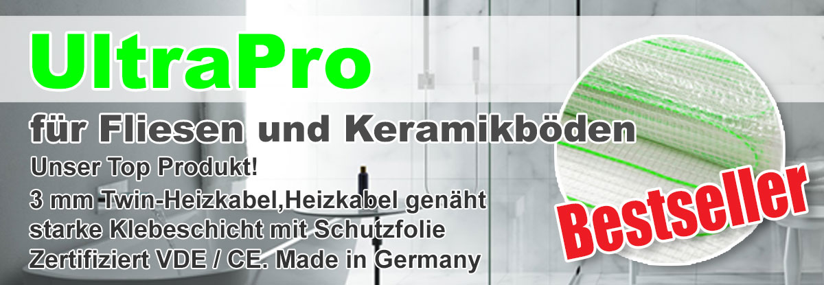 Excellente Fußbodenheizung für Fliesen und Natursteinböden. Die elektrische Heizmatte UltraPro mit 100 W/m² ist für alle fußkalten Bereiche im Alt- und Neubau sehr gut geeignet. Gut geeignet zur Bodentemperierung.Die Heizmatten sind komplett wartungsfrei. Das bedeutet, dass Sie für viele Jahre Wärme und Komfort genießen können. Wartungsfreie Technik und Wärmekomfort auf Knopfdruck.Durch die geringe Aufbauhöhe von nur 3 mm ist der Heizmatte auch bei nachträglichen Renovierungsarbeiten leicht einsetzbar. Heizmatte UltraPro 100: gleichmäßige Erwärmung leistungsoptimiert beste Qualität extra dünn (3mm) Heizkabel genäht starke Klebeseite (Stickymat) abgeschirmte Zweiaderheizleitung / TWIN kein messbares elektromagnetisches Feld wartungsfrei und langlebig Größen von 1 - 10 m² als Einzelheizmatte, Größen 11 - 30 m² je nach Verfügbarkeit als Kombination von 1 bis 2 Heizmatten. Thermostat RT-50 für elektrische Fußbodenheizung Der Thermostat RT-50 (neue Version) ist ein intelligenter, energiesparender Temperaturregler für elektrische Fußbodenheizungen.. Regelung über Raum- und Bodensensor, somit optimal geeignet für elektrische Fußbodenheizungen.Das Gerät erfüllt die Anforderungen der EU-Ökodesign-Richtlinie. Eigenschaften: Eingebauter Luftsensor und Bodentemperatursensor (Kabel NTC 10 kOhm). Programmierbar, 5 + 2 oder 6 + 1 oder 7 Tage Programm An / aus Schalter LCD-Touchscreen mit Hintergrundbeleuchtung Aktivierung von Sensoren (1, 2, 1 + 2) Ferienprogramm Kindersicherung Manueller Modus Frostschutzfunktion Anzeige für Fehlfunktionen des Sensors Automatische Bildschirmabschaltung Manueller ModusDer Regler ist mit der Funktion manueller Einstellungsmodus ausgestattet. Mit dieser Option stellen Sie eine konstante Temperatur ein, die jederzeitbeibehalten wird. WochenprogrammierungVollautomatische Nutzung durch Programmierung des Reglers, der Regler unterstützt eine 7-tägige Programmierung der Heizzeiten mit 6 Ereignissen pro Tag. Schnelle TemperaturanpassungIm Wochenprogrammbetrieb kann ohne Wechsel des Betriebsmodus die Temperatur schnell über die Pfeiltasten angepasst werden.Diese Einstellung ist temporär und wird mit Erreichen des nächsten programmierten Ereignisses wieder abgeschaltet. Die Montage des Thermostats erfolgt in Standard Unterputz-Schalterdosen, Durchmesser von 68 mm. Lieferumfang: Thermostat RT-50 Bodentemperaturfühler Montagematerial ausführliche Montageanleitung Elektrische Fußbodenheizungen in Top-Qualität - Made in Germany.Praktisches Komplett-Set, mit Thermostat und Fühlerrohr, von 1 bis 30 m² erhältlich. Die elektrische Heizmatte UltraPro mit 100 W/m² ist für alle fußkalten Bereiche im Alt- und Neubau sehr gut geeignet. Gut geeignet zur Bodentemperierung und als Raumheizung.Die Heizmatten sind komplett wartungsfrei. Das bedeutet, dass Sie für viele Jahre Wärme und Komfort genießen können. Wartungsfreie Technik und Wärmekomfort auf Knopfdruck.Durch die geringe Aufbauhöhe von nur 3 mm ist der Heizmatte auch bei nachträglichen Renovierungsarbeiten leicht einsetzbar. Vorteile elektrische Heizmatte UltraPro: extra dünn (Aufbauhöhe 3 mm), dadurch keine Erhöhung des Bodenniveaus hochwertige Heizleiter mit Isolation aus FEP Schnelle und einfache Installation Zweiader- TWIN Tewchnologie Heizkabel auf das Glasfasergewebe vernäht, dadurch einfache Verlegung. 100% Leistung und schnelle Erwärmung durch optimalen Schleifenabstand Modernste Produktionsanlagen und der Einsatz neuester Technologien garantieren hohe Qualtität und 100 Leistung. Die Heizmatte kann direkt unter den Fliesen im Fliesenkleber installiert werden.Bei einem anderen Bodenbelag z.B. Laminat oder Teppich wird die Heizmatte in Flex-Ausgleichsmasse eingespachtelt. (Überdeckung 5-10 mm).Direkt unter dem neuen Bodenbelag verlegt, sorgen unsere Dünnbettheizmatten mit wenig Aufwand schnell für Wärme im gesamten Raum. Lieferumfang: Elektrische Heizmatte für Fliesen 100 W/m² UltraPro Thermostat nach Wahl Kunstoffwellrohr für den Temperatursensor Montageanleitung Herstellergarantie auf die Heizmatte 10 Jahre, Thermostat 2 Jahre.