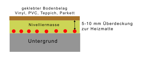 Bei geklebten Bodenbelägen wie Vinyl, Teppich oder Parkett müssen Sie eine Heizmatte für Fliesen verwenden. Die Heizmatte muss in Nivellier- Ausgleichsmasse eingebettet werden, mit einer Überdeckung von 5-10 mm.