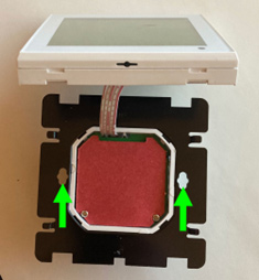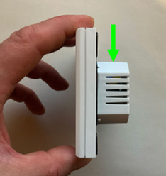Thermostat am Display halten. Mit leichtem Druck (grüner Pfeil) die Rückseite nach unten schieben.
