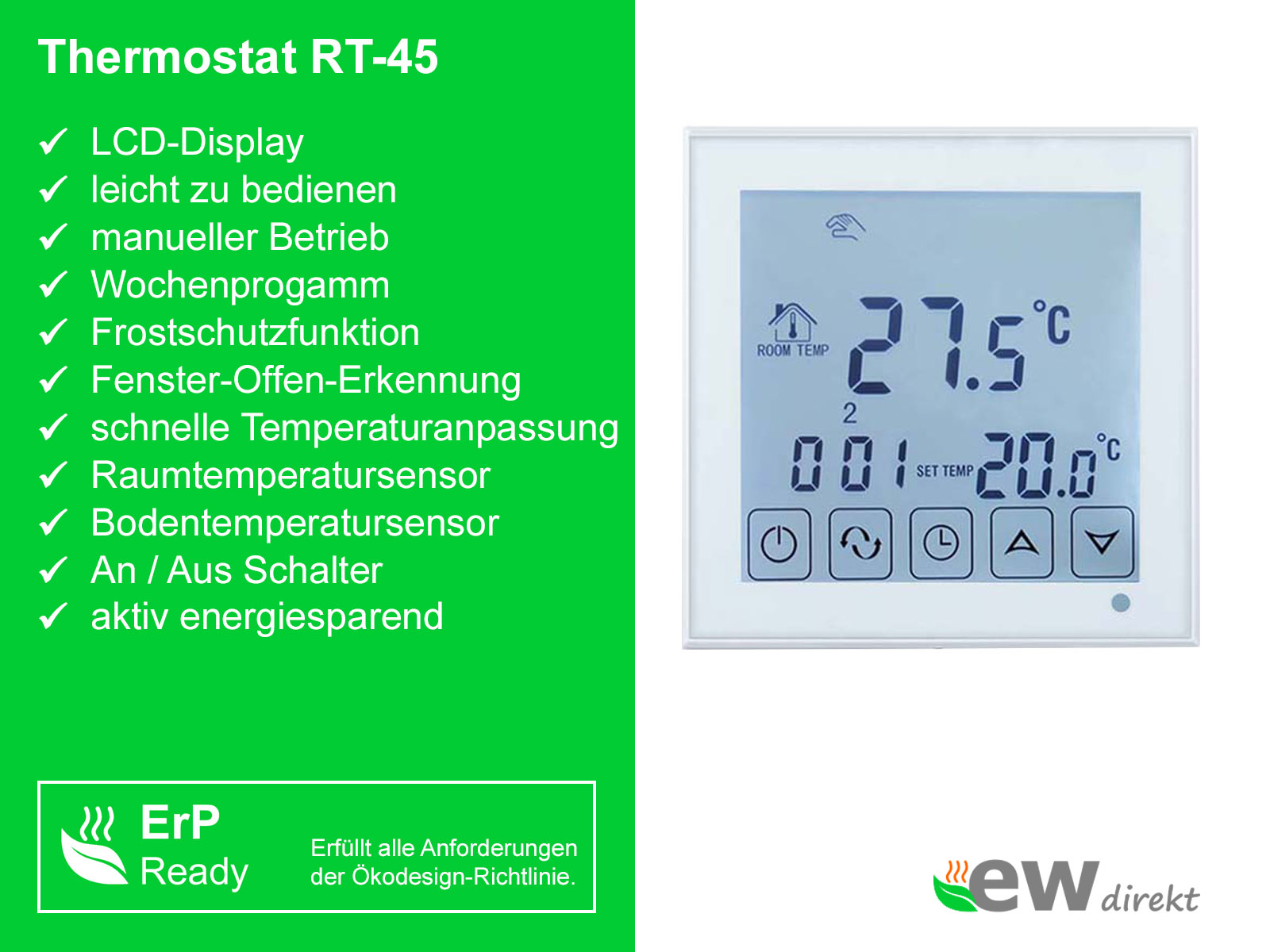 Der Thermostat RT-45 ist ein energiesparender Temperaturregler für elektrische Fußbodenheizungen.