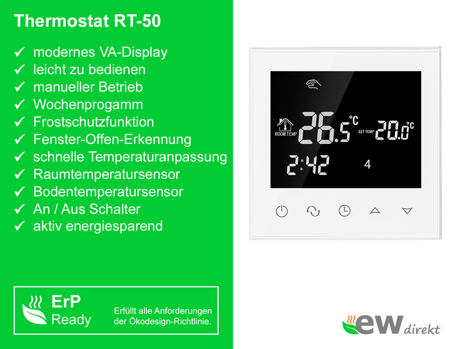 Der Thermostat RT-50 (neue Version) ist ein intelligenter, energiesparender Temperaturregler für elektrische Fußbodenheizungen..