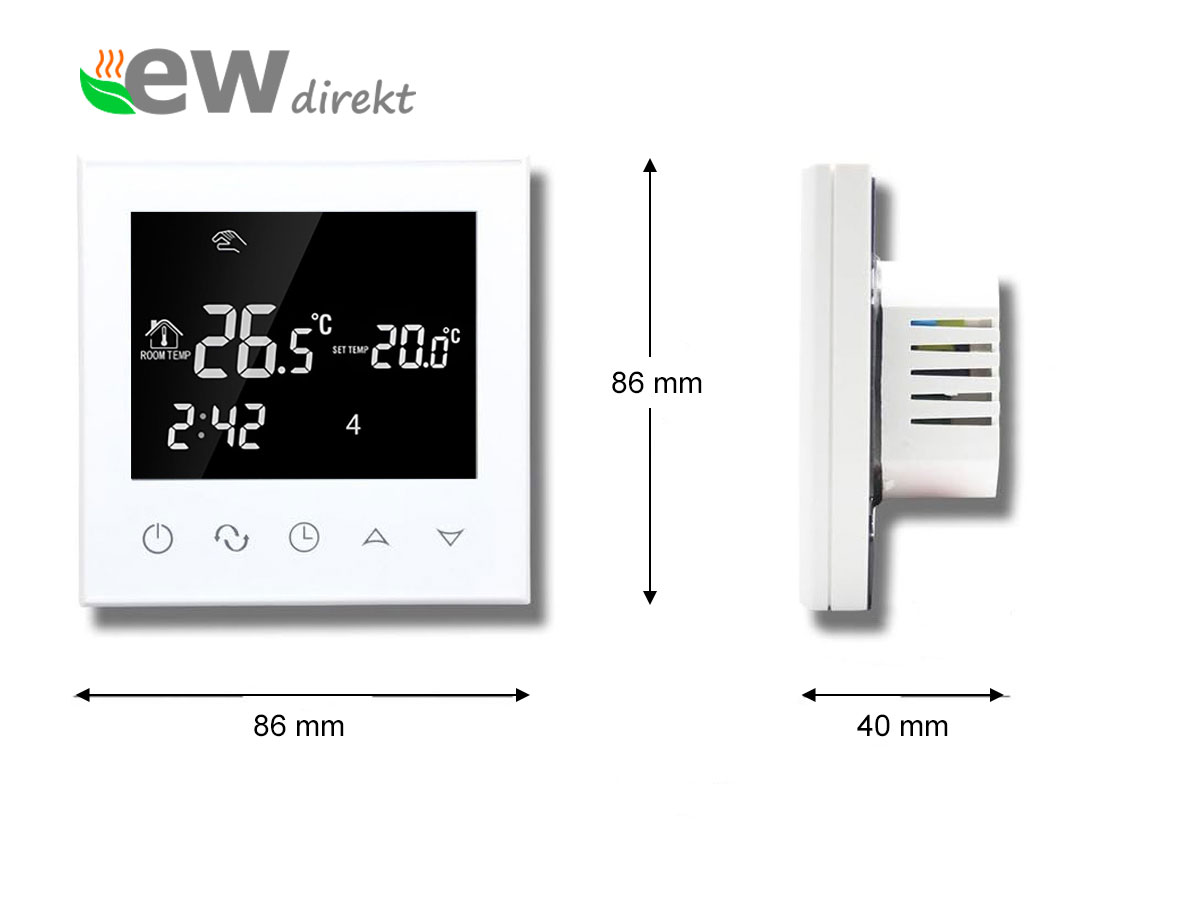 Regelung über Raum- und Bodensensor, somit optimal geeignet für elektrische Fußbodenheizungen.