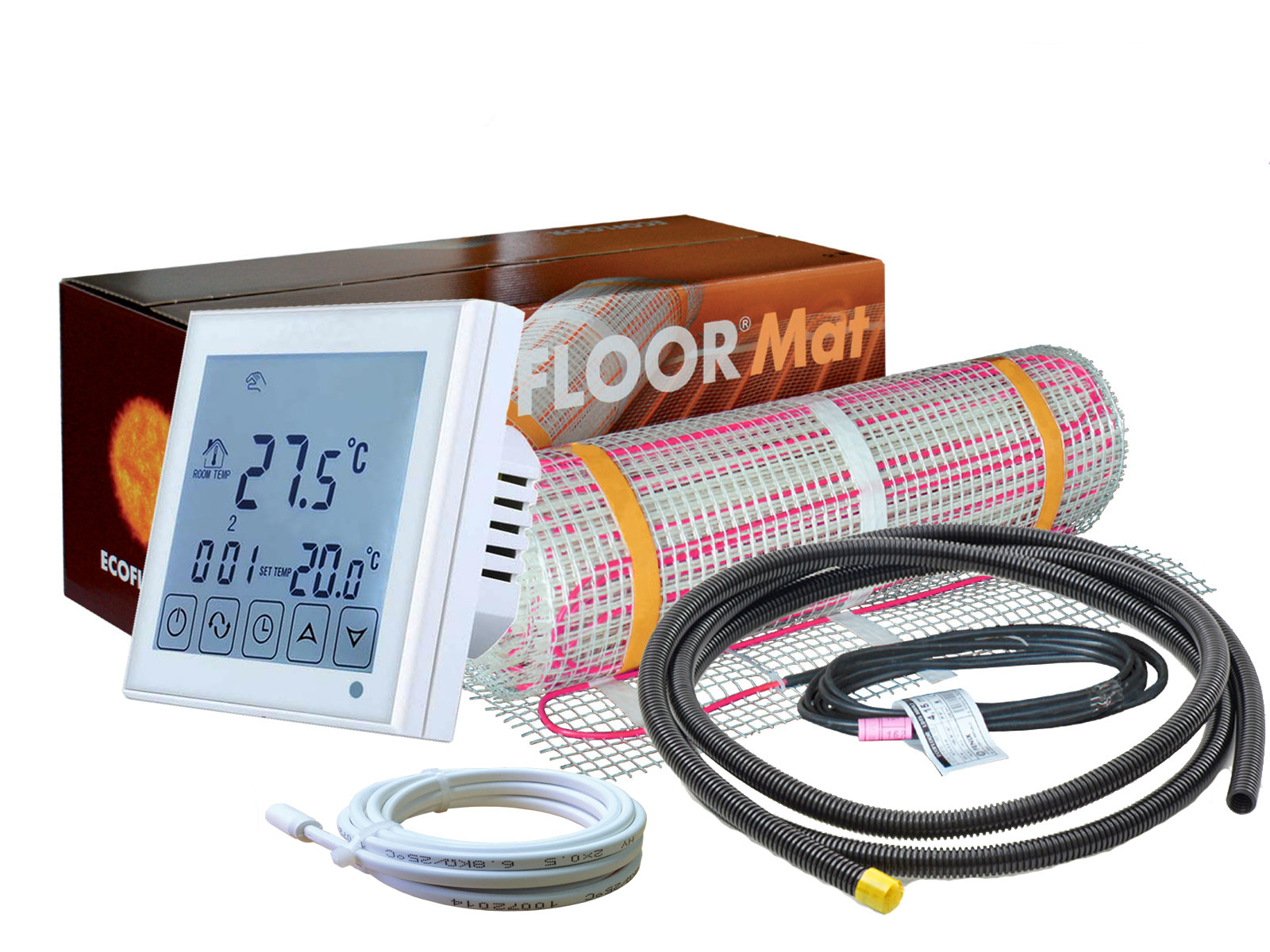 Elektrische Fußbodenheizungen in Top-Qualität - Made in Germany. Praktisches Komplett-Set, mit Thermostat und Fühlerrohr, von 1 bis 20 m² erhältlich. Lieferumfang: Elektrische Heizmatte SunPro für Fliesen 160 W/m² Thermostat RT-50 inkl. Temperatursensor Kunstoffwellrohr für den Temperatursensor Montageanleitung mit Prüfprotokoll (deutsch) Dieses Set beinhaltet alle für den Betrieb notwendigen Komponenten. Elektrische Heizmatte SunProDie elektrische Heizmatte SunPro mit 160 W/m² ist sehr gut geeignet zur Bodentemperierung und als Raumheizung. Die Heizmatten sind komplett wartungsfrei. Das bedeutet, dass Sie für viele Jahre Wärme und Komfort genießen können. Wartungsfreie Technik und Wärmekomfort auf Knopfdruck. Durch die geringe Aufbauhöhe von nur 3 mm ist der Heizmatte auch bei nachträglichen Renovierungsarbeiten leicht einsetzbar. Aufgrund ihrer geringen Aufbauhöhe von ca. 3 mm kann die Heizmatte problemlos unter den Fliesen / Naturstein in den Fliesenkleber bzw. eine dünne Schicht Ausgleichsmasse eingebettet werden. Vorteile elektrische Heizmatte: extra dünn (Aufbauhöhe 3 mm), dadurch keine Erhöhung des Bodenniveaus hochwertige Heizleiter mit Isolation aus FEP Schnelle und einfache Installation Heizkabel auf das Glasfasergewebe mit Klebebändern fixiert. schnelle Erwärmung durch optimalen Schleifenabstand  Thermostat RT-50Der Thermostat RT-50 ist ein intelligenter, energiesparender Temperaturregler für elektrische Fußbodenheizungen. Regelung über Raum- und Bodensensor, somit optimal geeignet für elektrische Fußbodenheizungen.Das Gerät erfüllt die Anforderungen der EU-Ökodesign-Richtlinie. Eigenschaften: Großes VA-DisplayEingebauter Luftsensor und Bodentemperatursensor (Kabel NTC 10 kOhm). Programmierbar, 5 + 2 oder 6 + 1 oder 7 Tage Programm An / aus Schalter LCD-Touchscreen mit Hintergrundbeleuchtung Aktivierung von Sensoren (1, 2, 1 + 2) Ferienprogramm Kindersicherung Manueller Modus Frostschutzfunktion Anzeige für Fehlfunktionen des Sensors Automatische Bildschirmabschaltung Manueller ModusDer Regler ist mit der Funktion manueller Einstellungsmodus ausgestattet. Mit dieser Option stellen Sie eine konstante Temperatur ein, die jederzeitbeibehalten wird. WochenprogrammierungVollautomatische Nutzung durch Programmierung des Reglers, der Regler unterstützt eine 7-tägige Programmierung der Heizzeiten mit 6 Ereignissen pro Tag. Schnelle TemperaturanpassungIm Wochenprogrammbetrieb kann ohne Wechsel des Betriebsmodus die Temperatur schnell über die Pfeiltasten angepasst werden.Diese Einstellung ist temporär und wird mit Erreichen des nächsten programmierten Ereignisses wieder abgeschaltet. Die Montage des Thermostats erfolgt in Standard Unterputz-Schalterdosen, Durchmesser von 68 mm.