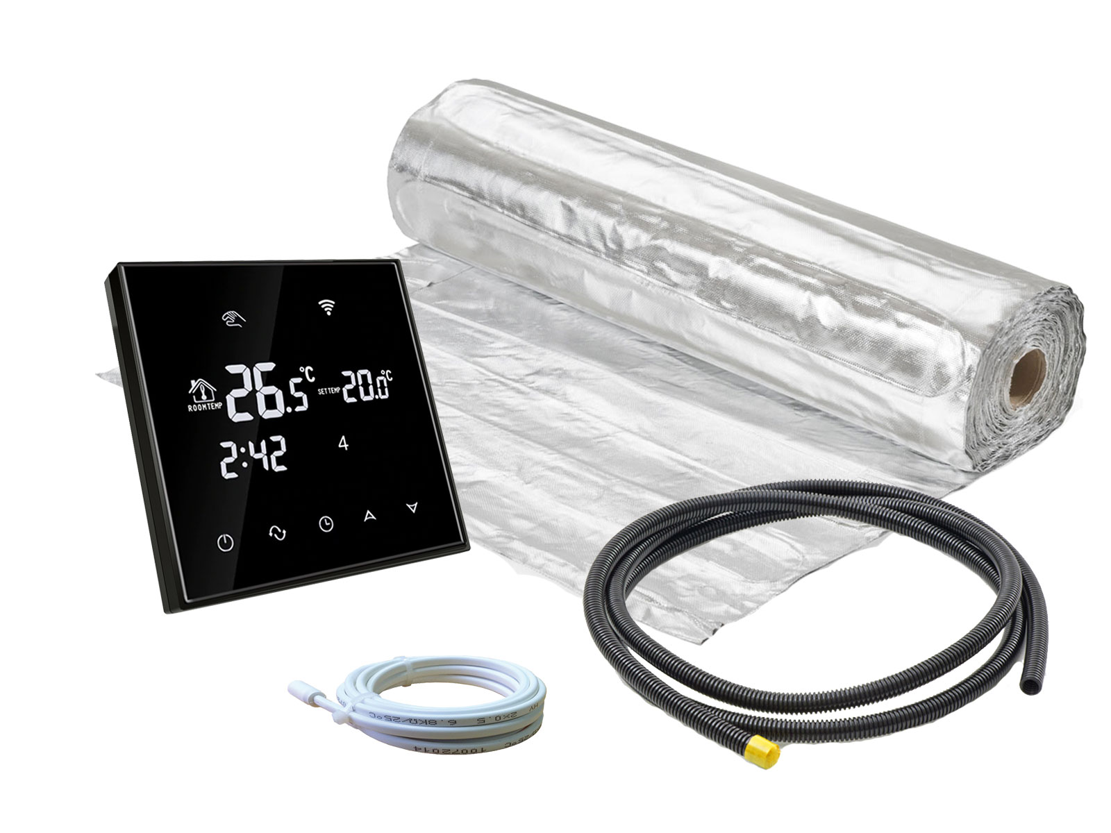 Elektrische Fußbodenheizung AluPro 140 im Komplett-Set mit Thermostat RT-65 Wlan. Da ist alles dabei, was man für die Installation benötigt.